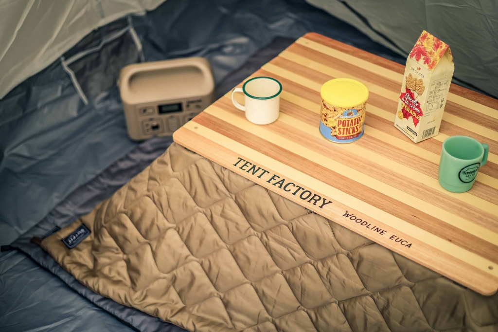 秋冬キャンプにおすすめ!「OUTFIT」ブランケットの特長や使い方を解説。 テントファクトリーの「OUTFITシリーズ」の中で現状唯一の寝具、「キルティングブランケット」。 ミリタリーキルト仕様でシックなアウトドアカラーが魅力のブランケット。大きめサイズで寝具にはもちろん、敷物にもひざ掛けやポンチョにもなるスグレモノ。コンパクトに収納できるのも良いですね。 そして…天板が外せるテーブルとの組み合わせで、こたつ風アレンジも可能なのです! くわしくはぜひLANTERNに掲載されたこちらの記事をチェックしてみてくださいね。 https://www.lantern.camp/?p=111671