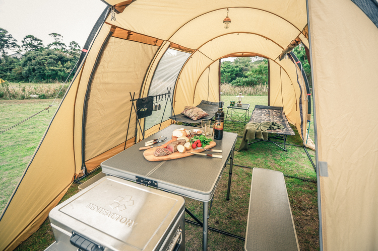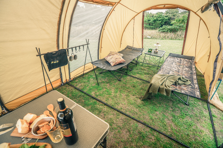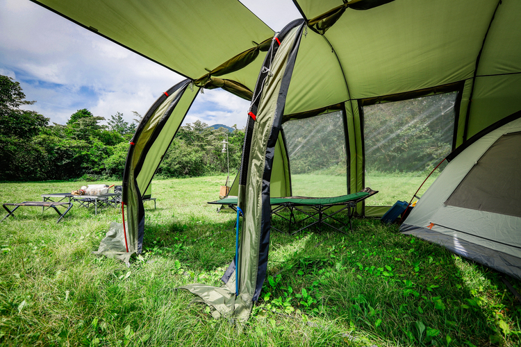 ・前後左右 4面全てがメッシュドア2重仕様なので、通気性にも優れ、キャンプだけでなくデイキャンプでも活躍します - ■オールシーズンアウトドアを楽しめる素材と仕様