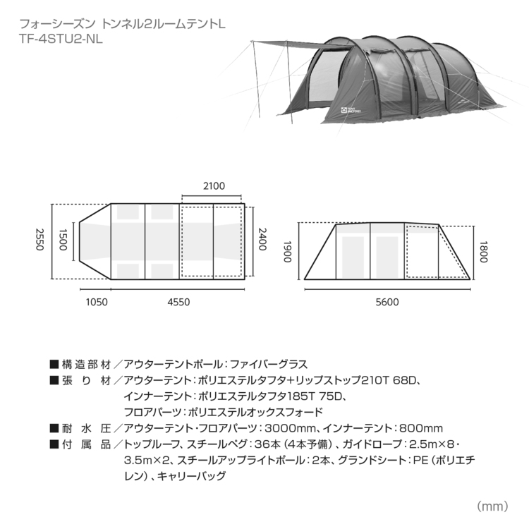 - ■アウターテント:ポリエステルタフタ+リップストップ210T 68D(耐水圧3000㎜)