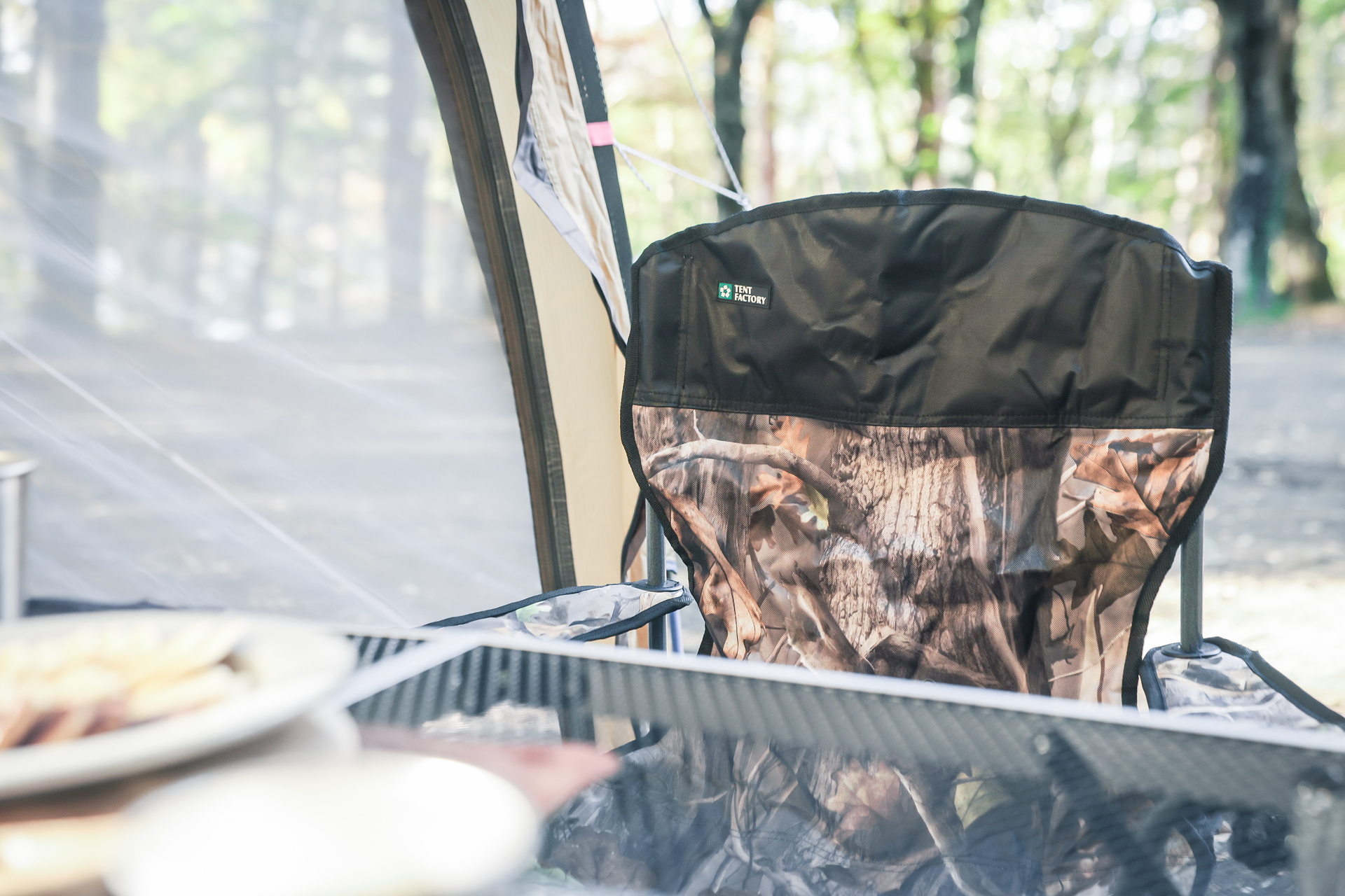 強度性・収納性に優れた、ゆったりサイズの収束型アクションチェア。テントファクトリーオリジナルデザイン・スパイダーシリーズ カモツリー柄とテスリンブラックの2色展開 -