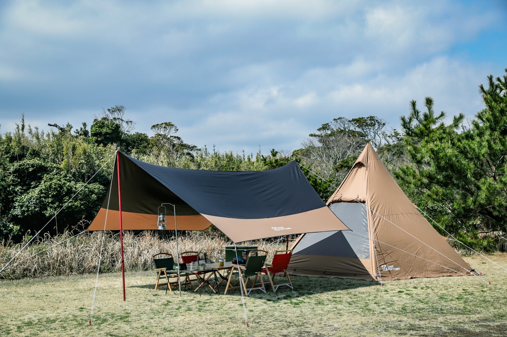 ワンポールテントは1人からでも速やかに設営・撤収ができ、その気軽さからキャンプだけでなくデイキャンプのタープ(日除け)としても最適です。テントファクトリーのワンポールテントは底面が六角形、幅が460㎝とワイド設計。