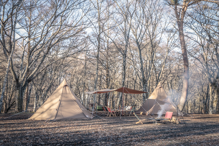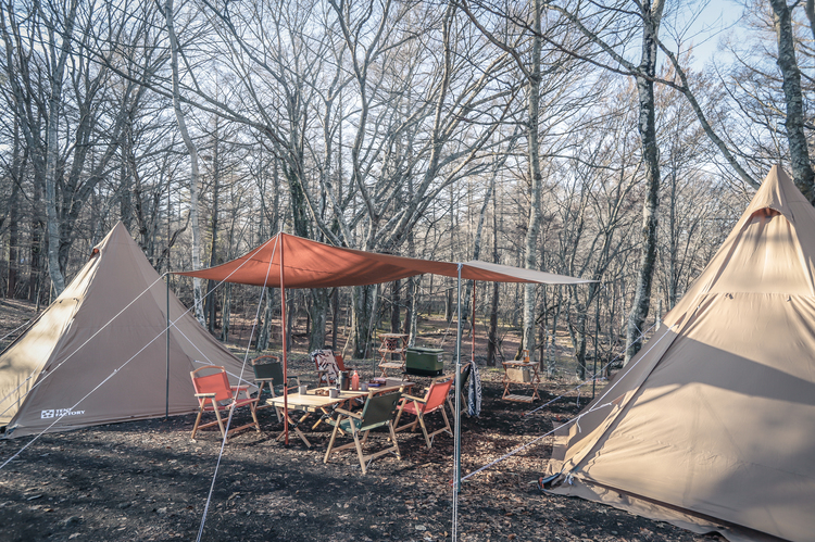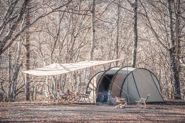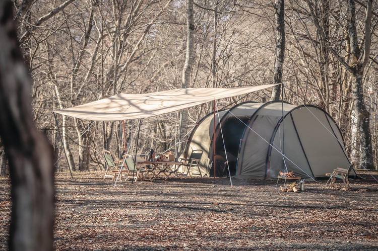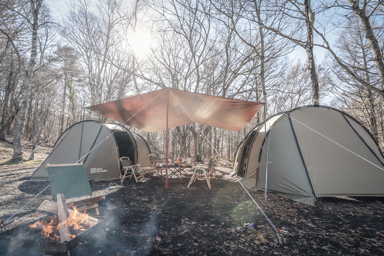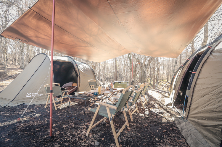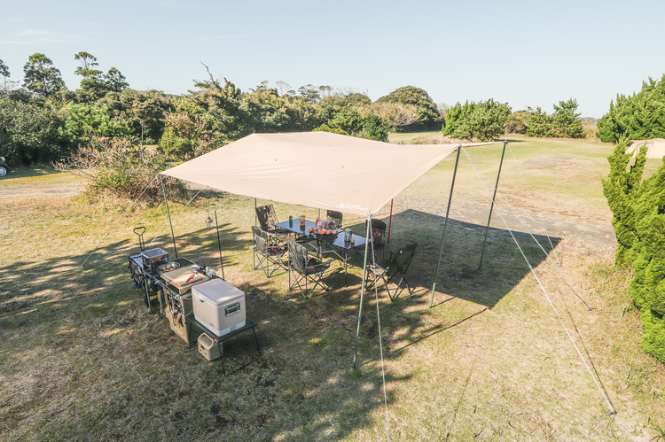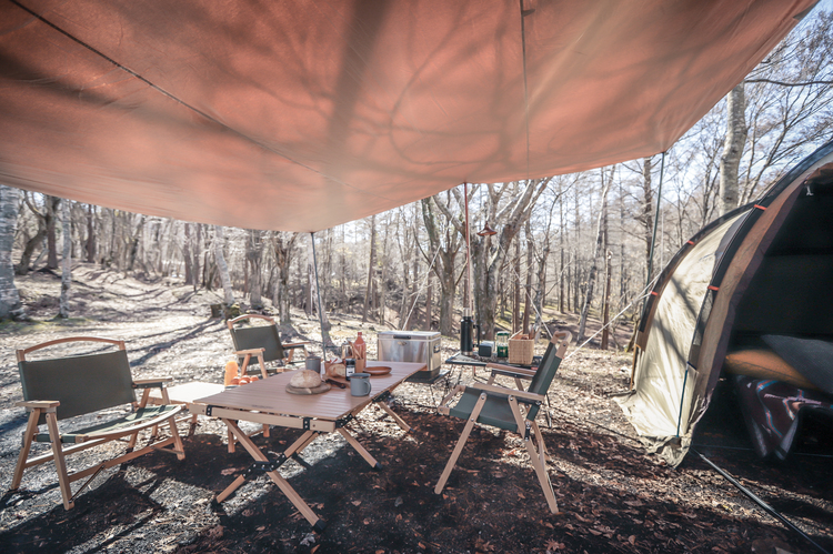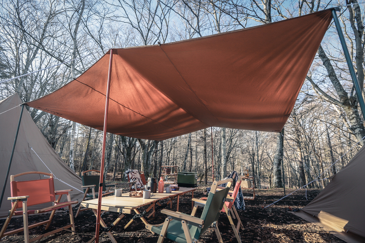 ・その点HiTCタープはすぐれた遮光・遮熱性能があり、タープ表面は熱くても裏側(タープの下)は快適になります。寒い時期には冷気を緩和する機能となるため、年間通じて活躍します(※使用場所・天候より体感には個人差があります)