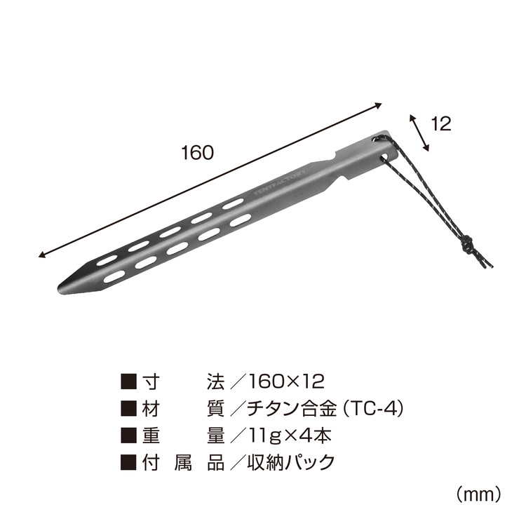 11gの軽量で堅牢・耐食性に優れたチタン合金製ペグ。差し込みし易く安定性に優れたV形状タイプ。 コンパクトな160㎜で荷物全体の軽量化をする各キャンプスタイルに最適(ソロスタイル・ツーリングスタイル・トレックスタイル)