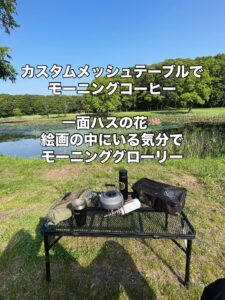 今回使っているのは、お馴染みのカスタムメッシュテーブル(TFCMT9045)。軽量なのに安定感があり、どんな地面でもしっかり脚が決まります。湖畔キャンプの朝、熱々のケトルやクッカーを置いても安心。ラグジュアリーなギアじゃなくても、こういう「安心できる道具」が結局一番頼りになりますね。