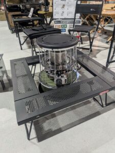 このテーブル、単なる置き台ではなく、ストーブ周りの“安心エリア”を作れるのが強み。アルパカストーブの様な石油ストーブとも相性が良く、うっかり近づきすぎるのを自然と防いでくれます。